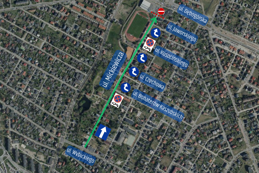 Na odcinku od ul. Wybickiego do zjazdu na parking MOSiR wprowadzony zostanie ruch jednokierunkowy w stronę ul. Dębogórskiej. Po prawej stronie jezdni (zgodnie z kierunkiem ruchu) będzie obowiązywał zakaz zatrzymywania się. Wjazd od ul. Dębogórskiej zostanie zamknięty, natomiast parking przy hali MOSiR pozostanie dostępny.