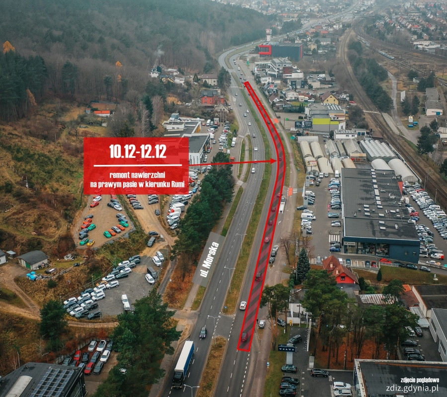 Od 10 grudnia trwa remont nawierzchni bitumicznej na ul. Morskiej – na odcinku od numeru 314 do granicy Gdyni z Rumią. Prace potrwają do soboty, 13 grudnia.