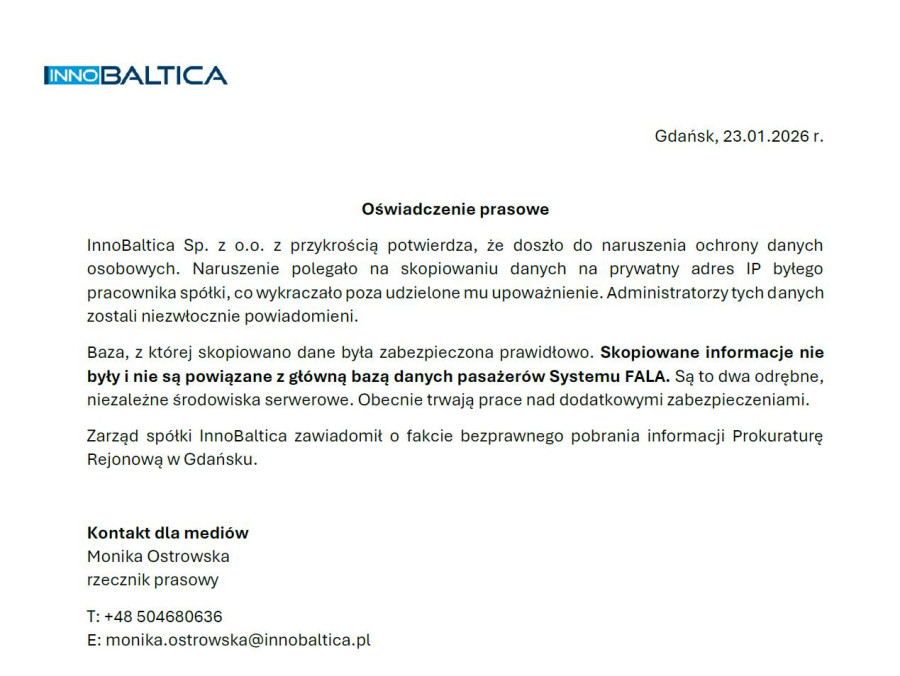 Spółka w oświadczeniu napisała: Żadne dane nie wyciekły z Systemu FALA. Dane pasażerów są w 100% bezpieczne. Skopiowane przez byłego pracownika spółki informacje nie były i nie są powiązane z centralną bazą danych pasażerów Systemu FALA. O fakcie bezprawnego pobrania informacji Zarząd spółki niezwłocznie zawiadomił Prokuraturę Rejonową w Gdańsku.