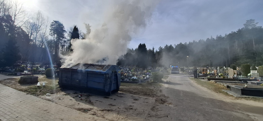 Straż Miejska w Wejherowo otrzymała zgłoszenie o pożarze na cmentarzu przy ul. ks. Roszczynialskiego. Z informacji przekazanej przez zgłaszającego wynikało, że ogień pojawił się w kontenerze na odpady.