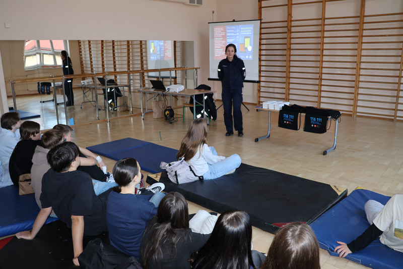 Funkcjonariusze w przystępny i angażujący sposób poruszyli tematy związane z zagrożeniami w sieci, takimi jak cyberprzemoc, hejt czy niewłaściwe korzystanie z mediów społecznościowych. Uczniowie dowiedzieli się, jak rozpoznawać niebezpieczne sytuacje, jak reagować na przemoc w internecie oraz gdzie szukać pomocy w przypadku problemów.