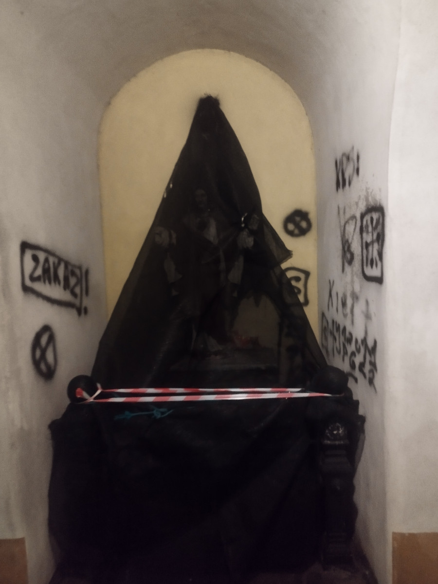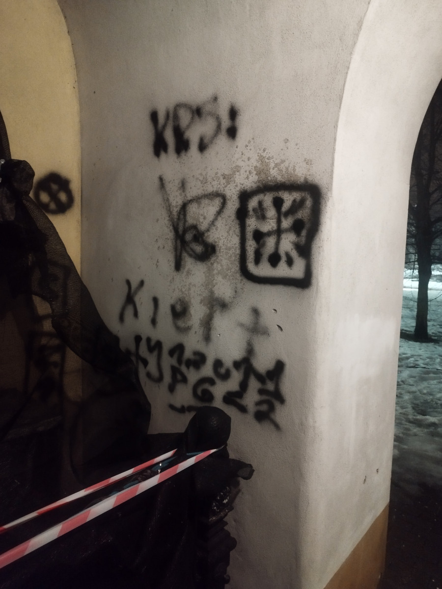 Ze zgłoszenia wstępnie wynikło, iż świadek widział idącą kobietę, która zerwała z ogrodzenia baner i skryła się w Kaplicy. Do aktu wandalizmu doszło w nocy z 24 na 25 lutego.