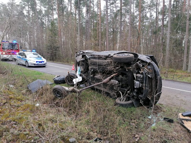 Według wstępnych ustaleń 23-latek kierujący pojazdem marki Volkswagen prawdopodobnie stracił panowanie nad pojazdem i uderzył w przydrożne drzewo, zniszczony samochód wywrócił się na bok.